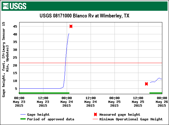 Gage height (in feet) of the Blanco River at Wimberly, May 23 to May 25, 2015